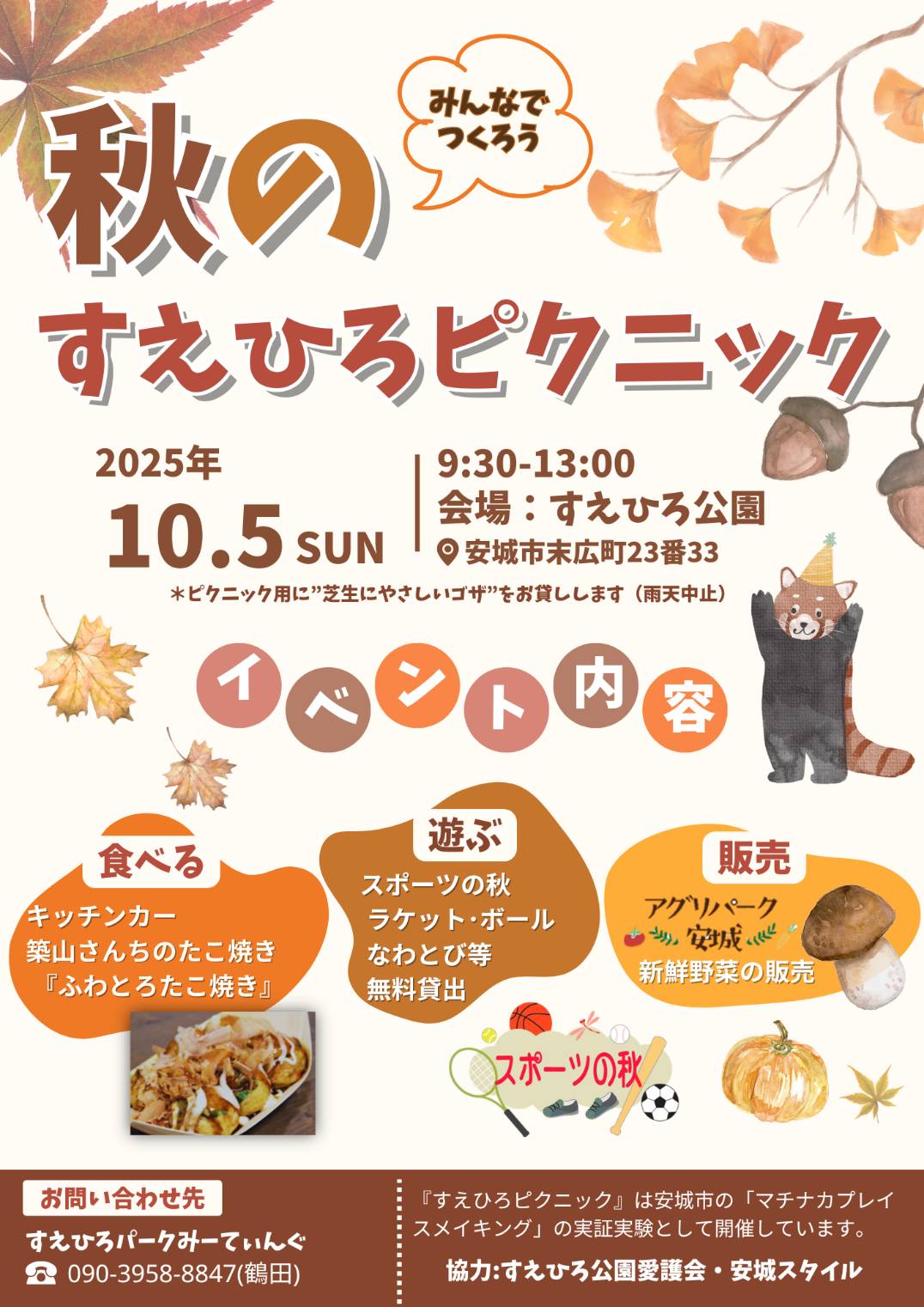 偶数月の第1日曜日(2月・8月を除く)に開催している「すえひろピクニック」が2025年10月5日(日)、末広公園で開催されます。キッチンカー、とれたて野菜のテントなどが出店し、のどかな雰囲気の中、芝生などでのんびりと遊ぶことができます。